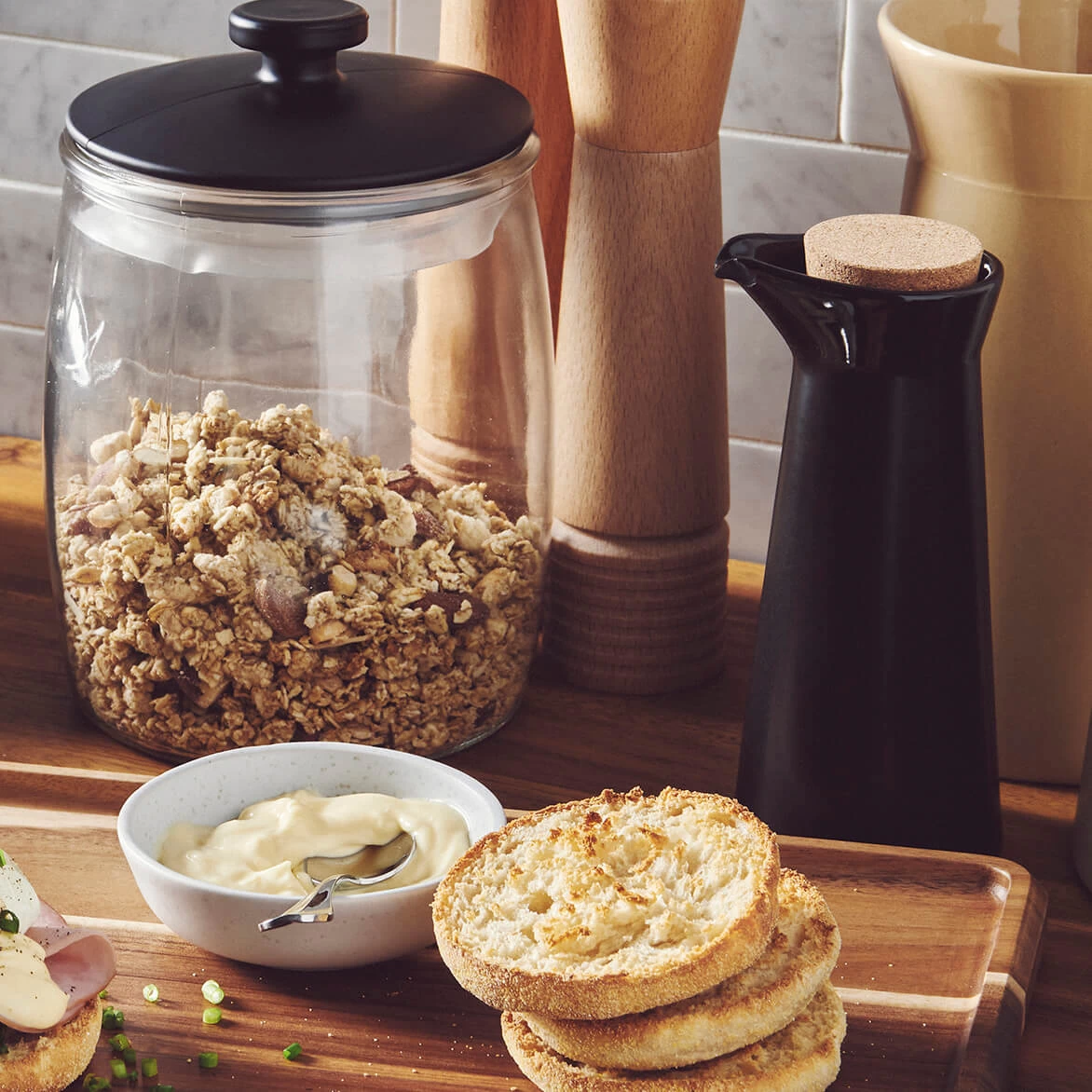 We’re big fans of serving a gluttonous charcuterie board and sitting around it swapping stories with friends. (Cheese and gossip are equally delicious!) For an effortless everyday style, we turn to our Industry rectangle paddle board. Crafted from fine-quality solid acacia wood and finished with a lovely elevated chamfered edge, it keeps any lose grapes or pistachios from rolling over the edge. Although a large size, it’s lightweight and has a handle for easy serving, and a hole if you fancy hanging it in your kitchen.