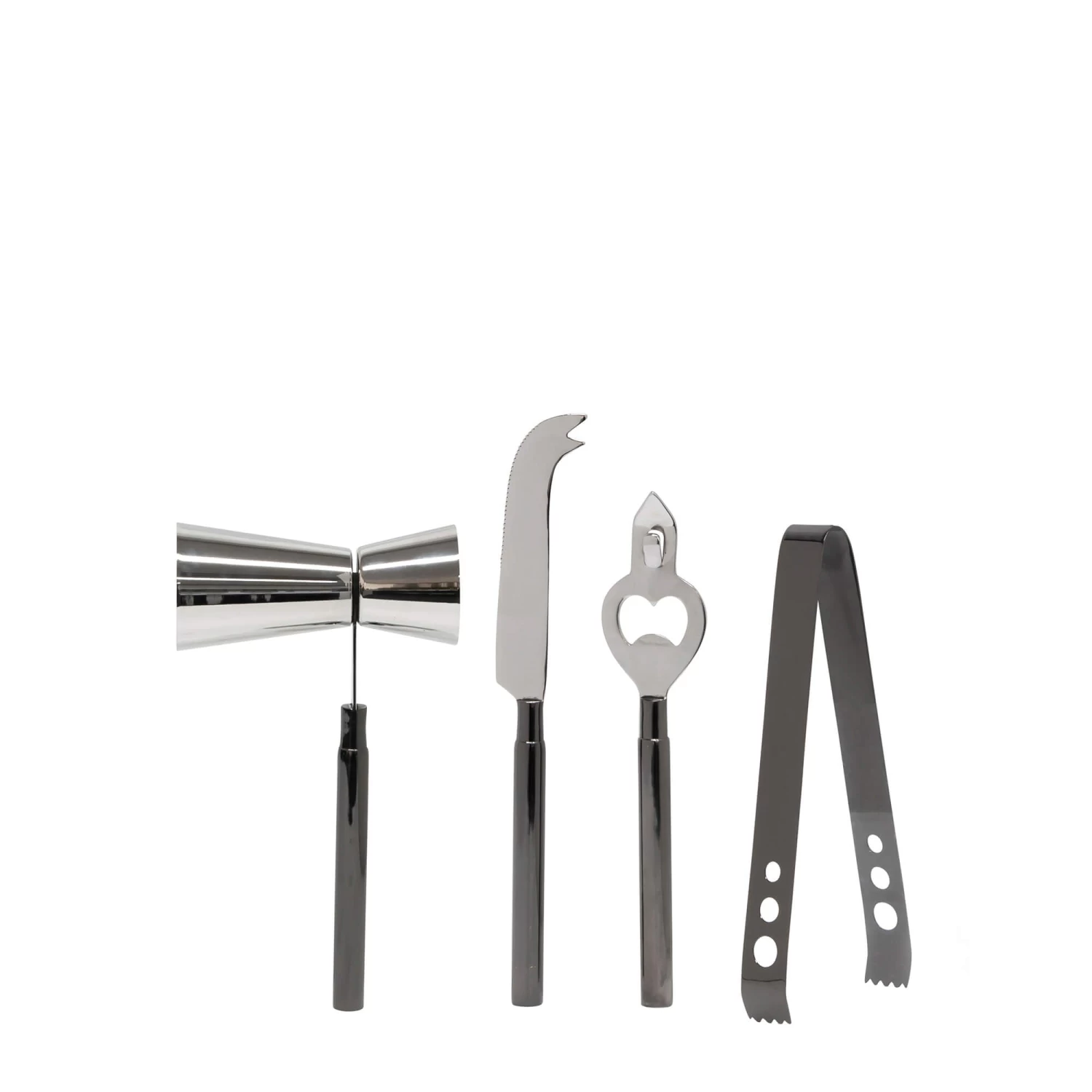 Cocktail time, baby! We’ve got the tools to make a great drink, and it’s all in our Kennedy metallic cocktail set. Our sleek black station is made from high-quality stainless steel, and it comes with everything you need to mix up a delicious cocktail – or two! Set includes a shaker to shake up your favourite mix and a jigger with dual measure of 60mL and 30mL for the perfect shot. We’ve even added a matching ice tong so you can keep your fingers nice and dry, and the prong knife is perfect for cutting up those wedges. And when you just want to pop open a cold one or your chosen mixer, the bonus bottle opener comes in handy. With a cleverly designed storage compartment, you can keep your bar accessories organised and ready to use (just remember to hand wash them only)! So, get ready to shake things up and make some new friends – both human and liquor – with Kennedy!