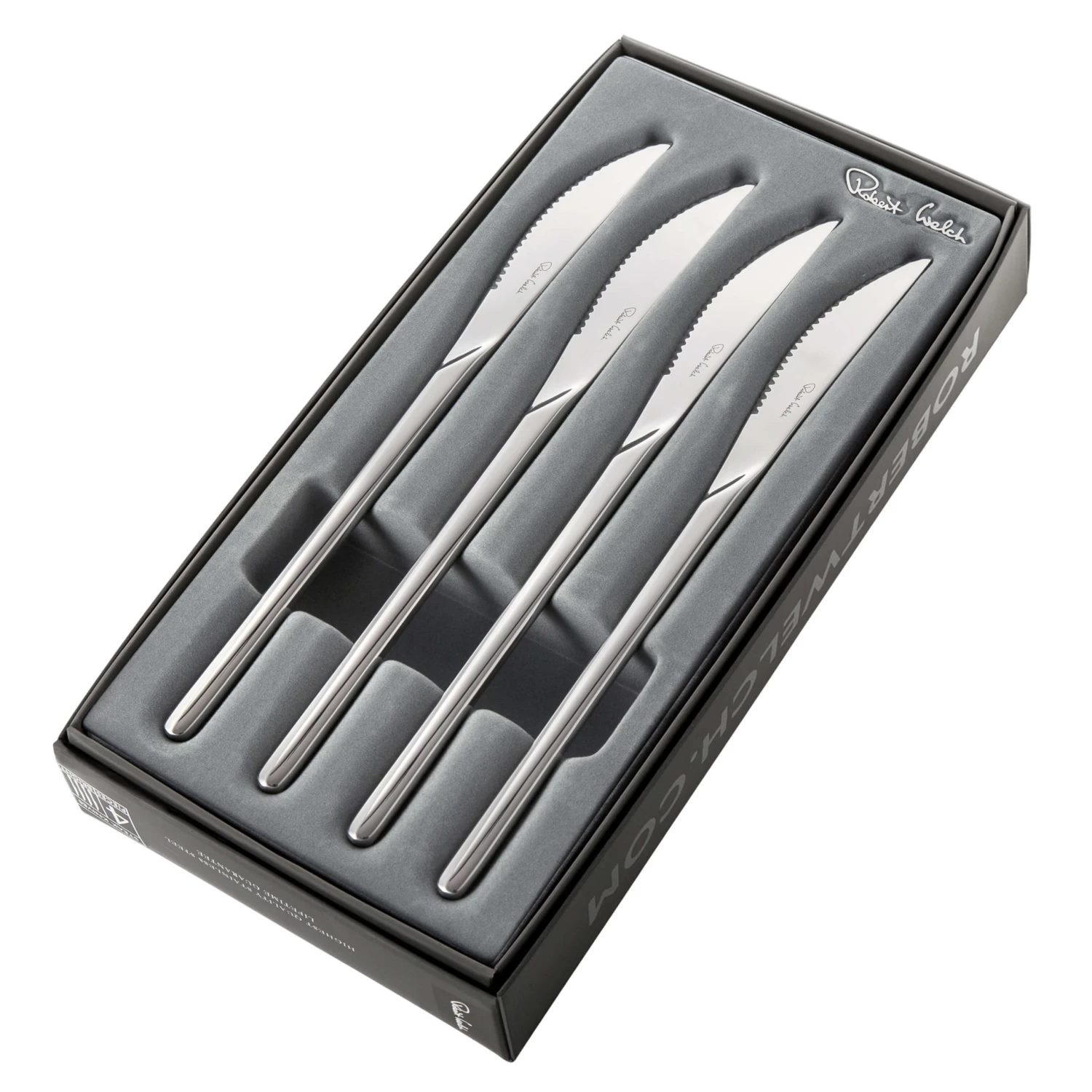 The Robert Welch Bud set of 4 Steak Knives come with a one of a kind slender handled design, which sits seamlessly in the palm of the hand. Featuring a mirror finish, this 4 piece steak knife set is made from specially hardened stainless steel to ensure the finest possible cutting edge. Conveniently gift boxed, dishwasher safe and comes with a lifetime guarantee. Now the question is eye fillet or rump steak?