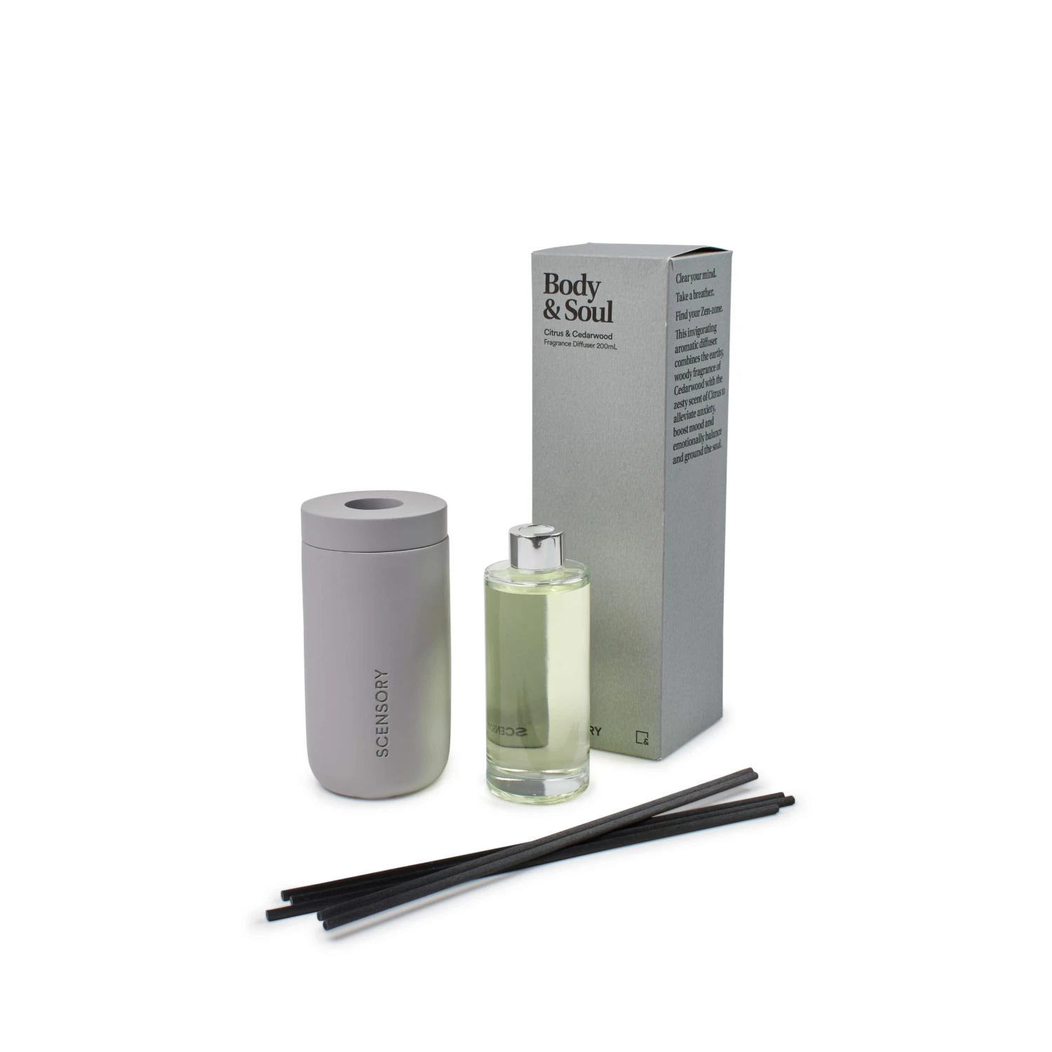 Escape with your senses and find serenity with our Body & Soul diffuser. Housed in a 200mL matte grey vessel crafted from cement, our diffuser means business (and relaxation!). Brace yourself for the ultimate sensory experience as the rejuvenating essence of cedarwood intertwines with the zesty burst of citrus. Together, they form a dynamic duo that banishes anxiety, uplifts your spirits and brings emotional harmony to your soul. Bid farewell to chaos and immerse yourself in our Scensory collection, preparing for an aromatic escapade that replenishes your body and nourishes your soul.