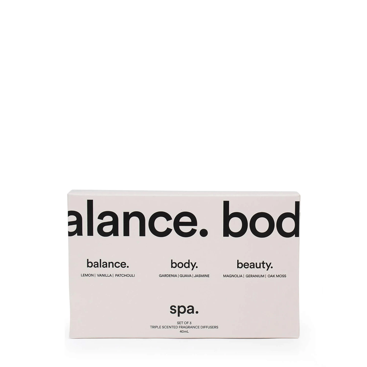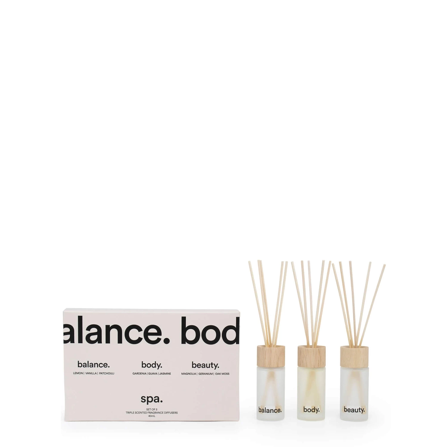 Find time to relax, any time of the day with our Spa 3 Piece diffuser set, which includes our fragrances balance, body and beauty. Balance: A divine gourmand blend of lemon, vanilla and patchouli. Body: A fresh blend of gardenia, guava, jasmine and wood. Beauty: A floral, high-end blend of magnolia, geranium and oak moss. Each diffuser includes essential oils hand picked from European perfumeries and has a lifespan of up 2 weeks. Spa will calm and relax, even if it is only for 5 mins between school pick up and dinner prep.